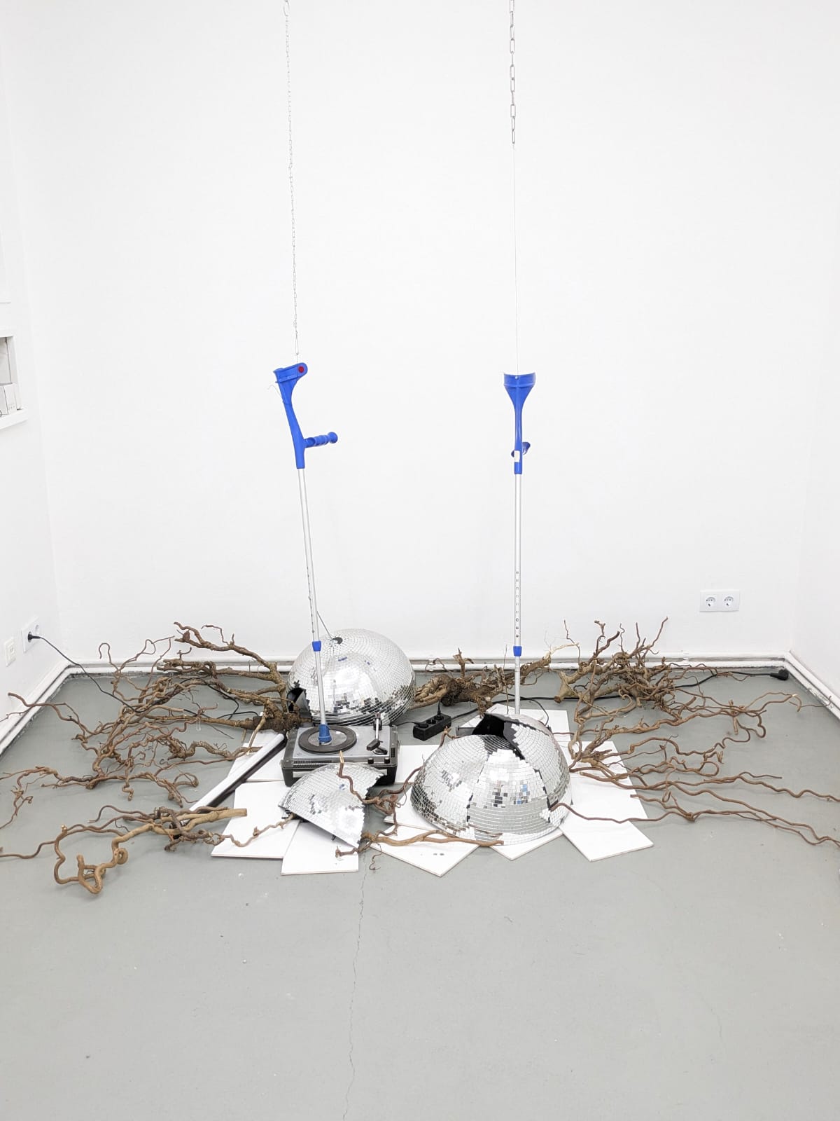drehende Plattenspieler, Krücken, Discokugel, Fliese et al.