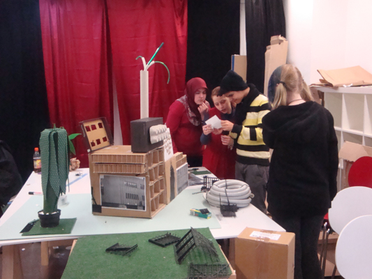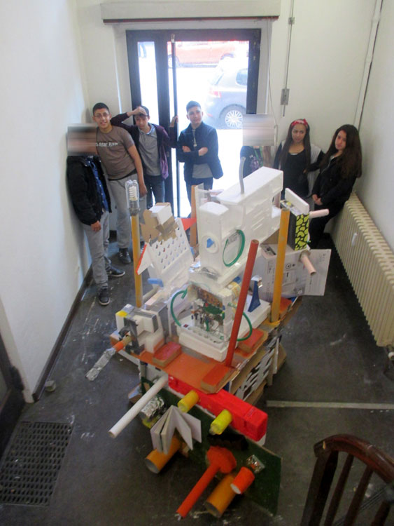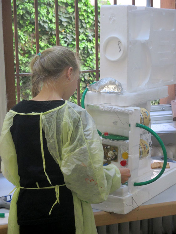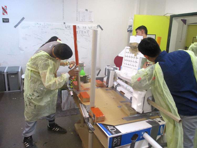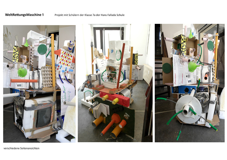 | In einem 3 tägigen workshop im YoungartsNeukölln mit der Klasse 7a der Hans Fallada Schule in Neukölln bauen wir die erste WeltRettungs Maschine. Diese ist in der Lage, die von uns als negativ empfundenen Dinge in der Welt ins Postive zu verwandeln. |
